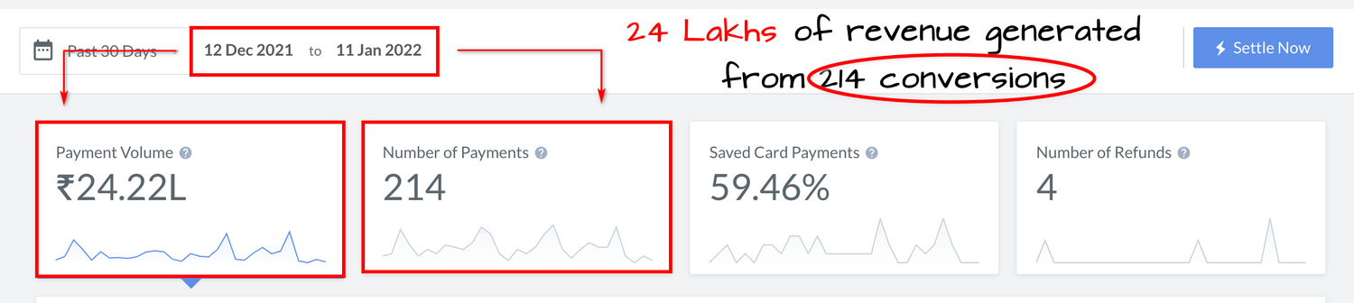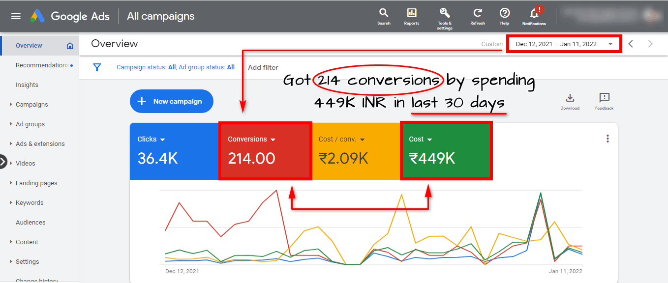 We ran a conversion campaign for one of our clients. In total, we have spent 449K INR and got 214 conversions from over 36,000 clicks with a conversion cost of 2k.